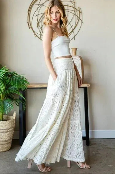 "Sweet Jane" Mineral Wash White Eyelet Tiered Maxi Skirt